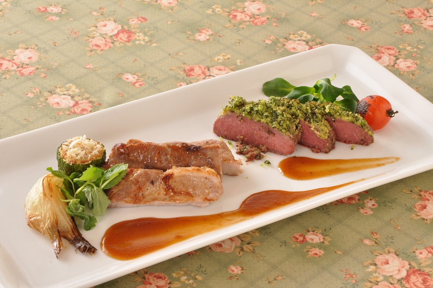 C:仔羊のペルシャードとイベリコポークのソテー 春野菜を添えて